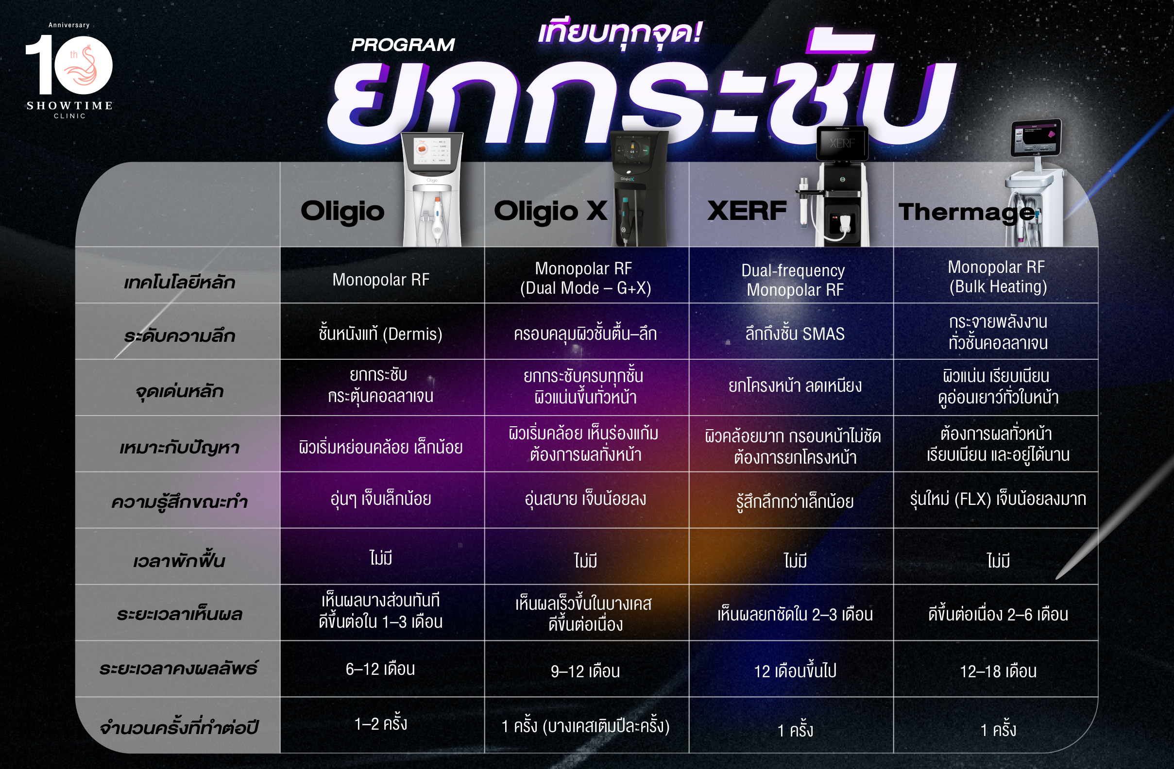 สรุป เทคโนโลยียกกระชับหน้าโดยไม่ต้องผ่าตัด ปัจจุบันมีให้เลือกหลากหลาย ไม่ว่าจะเป็น Oligio, Oligio X, XERF หรือ Thermage แต่ละเครื่องมีจุดเด่นและระดับพลังงานที่แตกต่างกัน เหมาะกับสภาพผิวและความต้องการของแต่ละคนที่ไม่เหมือนกัน