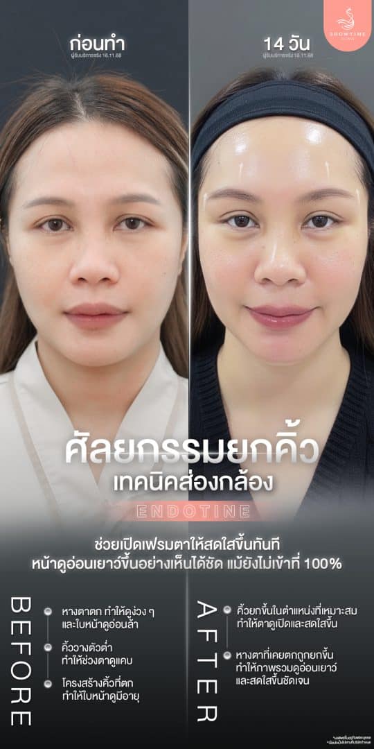 ที่ Showtime Clinic เราให้ความสำคัญกับความละเอียดในทุกขั้นตอน ตั้งแต่การประเมินโครงสร้างใบหน้าและตำแหน่งคิ้วของแต่ละบุคคล ไปจนถึงการยกคิ้วด้วยเทคนิคส่องกล้องร่วมกับ Endotine ซึ่งช่วยให้ยกได้แม่นยำยิ่งขึ้น ผลลัพธ์ที่ได้คือ “คิ้วยกละมุน” และ “กรอบตาที่ดูสดใสขึ้นทันที” โดยยังเป็นตัวคุณในเวอร์ชันที่ดูดีขึ้นแบบไม่ฝืนธรรมชาติ